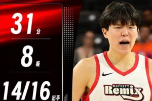 杨瀚森全场出战31分40秒,16投14中,三分1中1,罚球1中1,空砍G联盟生涯新高的31分,另有8篮板3助攻1抢断1盖帽进账,正负值+13全队最高。
