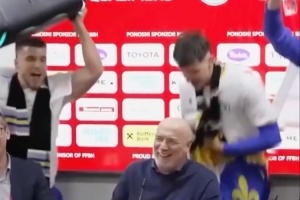 波黑主帅巴巴雷茨出席赛后发布会,波黑球员带着音响闯入发布会现场,庆祝球队晋级世界杯。