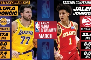 体育资讯4月3日讯 今日NBA官方宣布,湖人球星东契奇和老鹰球星杰伦·约翰逊分别当选三月份西部和东部联盟月度最佳球员。
