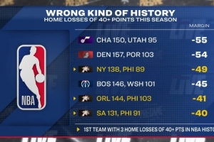 转播方赛前晒出一组数据,本赛季共有6次主队输球至少净负40分的情况: